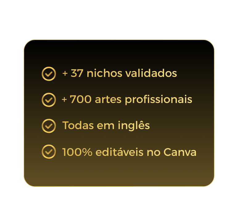 Com um único investimento, você recebe acesso a um conjunto completo de packs de artes profissionais, organizados por diversos nichos diferentes, prontos para usar, editar ou revender.